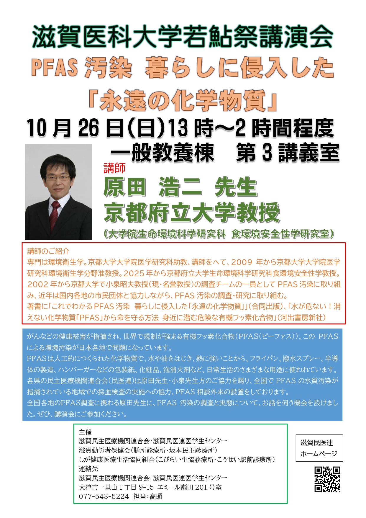 【滋賀】10/26(日)13時~:滋賀医大若鮎祭 原田浩二先生講演会『PFAS汚染 暮らしに侵入した「永遠の化学物質」』
