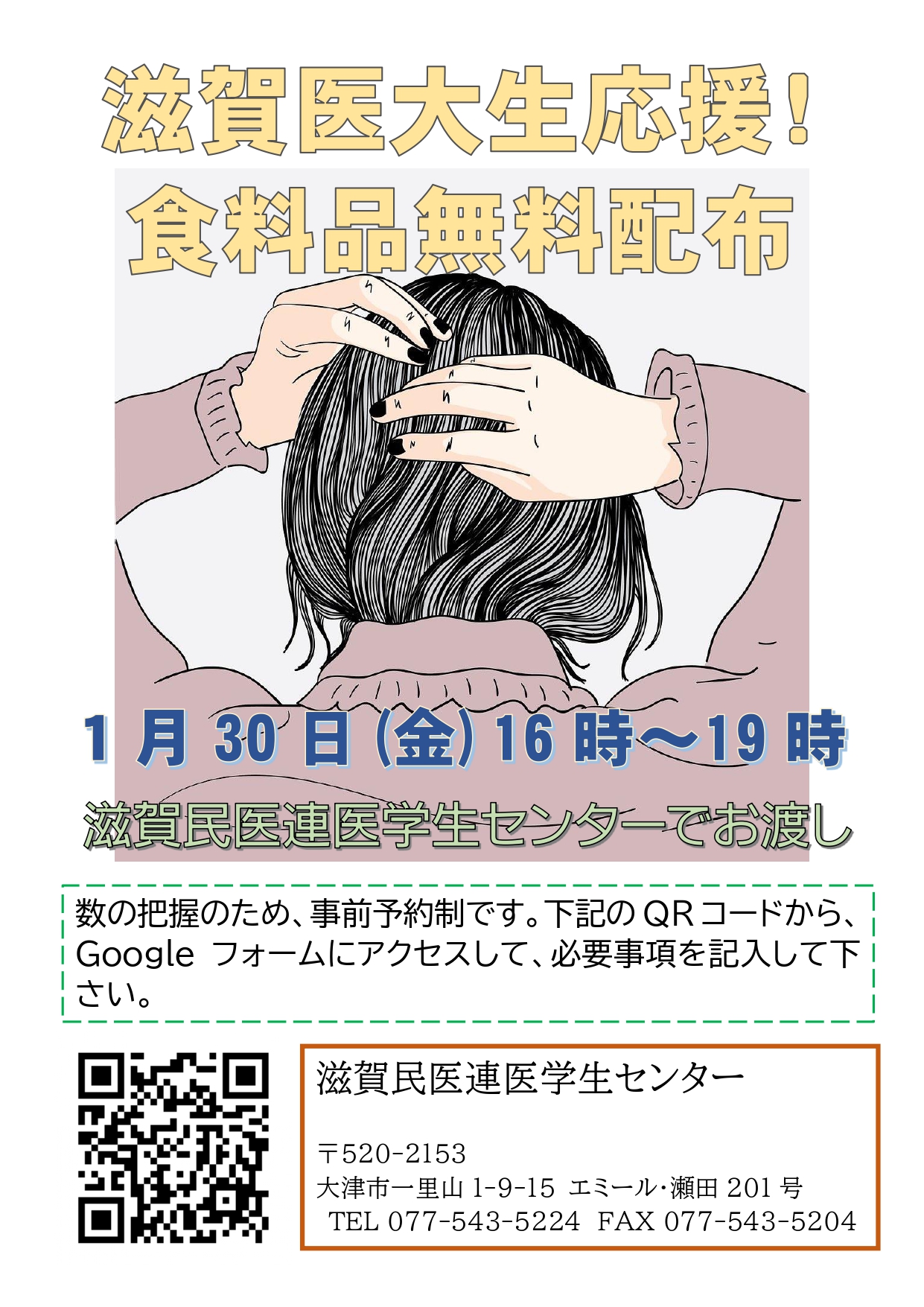 【滋賀】1/30(金)16時~19時:滋賀医大生応援!食料品無料配布(場所:滋賀民医連医学生センター)
