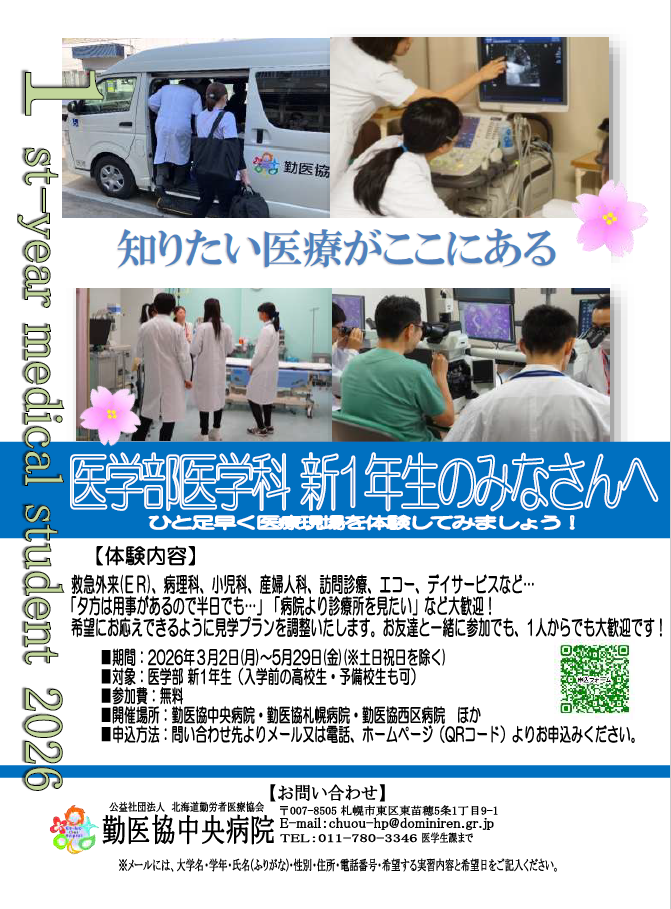 【北海道】勤医協中央病院 医学部合格お祝い会と春実習のご案内