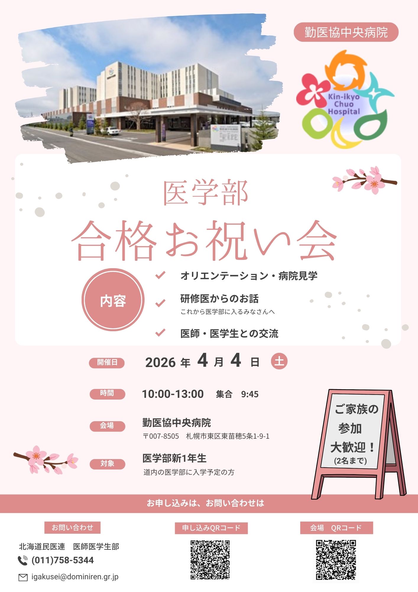 勤医協中央病院では、医学部新入学生の方を対象に合格お祝い企画を開催します🎵